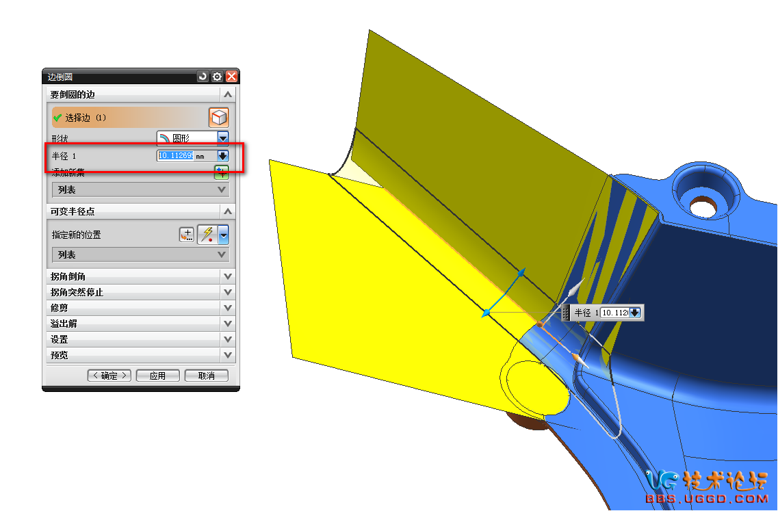 3.用“幾何屬性”命令測量兩個(gè)面之間的R角是多少,并且將R角的數(shù)據(jù)復(fù)制下來,然后用“邊倒圓”命令將R角倒上,粘貼R角的數(shù)據(jù)到半徑1對話框中,確定