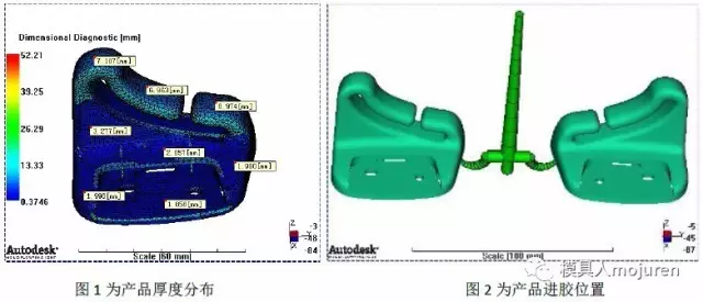 此產(chǎn)品為汽車安全帶固定件: 產(chǎn)品最大外形尺寸:70*45*63,產(chǎn)品平均肉厚:1.8~7.0mm,產(chǎn)品肉厚差異較大,因此采用3D網(wǎng)格分析,如圖1所示。材料:ABS+PA6-GF8 Terblend N NG-02 : BASF .此材料已做修正,質(zhì)量指示器為銀級,此材料可信度較高。 模具為一模兩件,由于產(chǎn)品量大,因此進(jìn)膠方式為冷流道隧道澆口進(jìn)膠,如圖2所示。