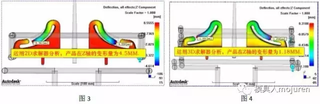 此產(chǎn)品雖有拐角,但不可使用雙層面網(wǎng)格含有拐角效應(yīng)的選項(xiàng)進(jìn)行分析,由于此產(chǎn)品的形狀、壁厚分部不均且壁厚變化較大已不符合使用雙層面網(wǎng)格的要求(在這里我用雙層面網(wǎng)格分析了一下,如圖3所示。分析出的變形高達(dá)4.5MM),因此采用3D網(wǎng)格分析,分析出來的產(chǎn)品最大變形為1.18MM,如圖4所示。