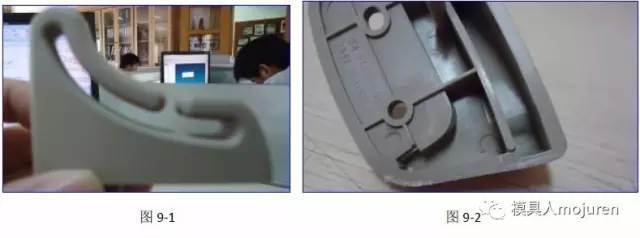 在這里制品仍做了1.2MM的反變形,澆口由原來的牛角進(jìn)膠改為現(xiàn)在的大水口搭底進(jìn)膠,分流道改為了S形,可防止主流道及分流道 的冷料進(jìn)入模腔。實(shí)際的試模產(chǎn)品如圖9-1、9-2所示,產(chǎn)品無變形