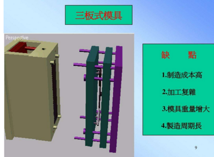 細(xì)水口模具又叫三板式模具,的流道及澆口不在分型線上,一般直接在產(chǎn)品上,所以我們?cè)谠O(shè)計(jì)的時(shí)候多一組水口分模線,設(shè)計(jì)較為復(fù)雜,加工較困難,一般要視產(chǎn)品和客戶要求而選用細(xì)水口系統(tǒng)。這種模具的澆口位置選擇的地方比較多,而且開模時(shí)流道澆口與產(chǎn)品會(huì)自動(dòng)分開,也省去了剪澆口這一步驟,被稱呼為三板式模具
